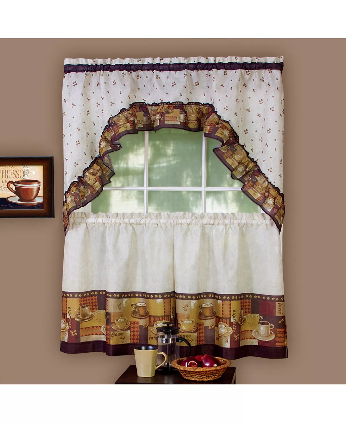 Cappuccino, cafe, and latte makes coffee a charming addition to any kitchen. You can almost smell the aroma of brewing coffee inviting you to sit back, relax and enjoy a cup with family and friends. Coffee is a favorite way to start the day and a warming way to change the look of your kitchen with a delightful new design. Rich chocolate brown for rod pocket header and borders of design.