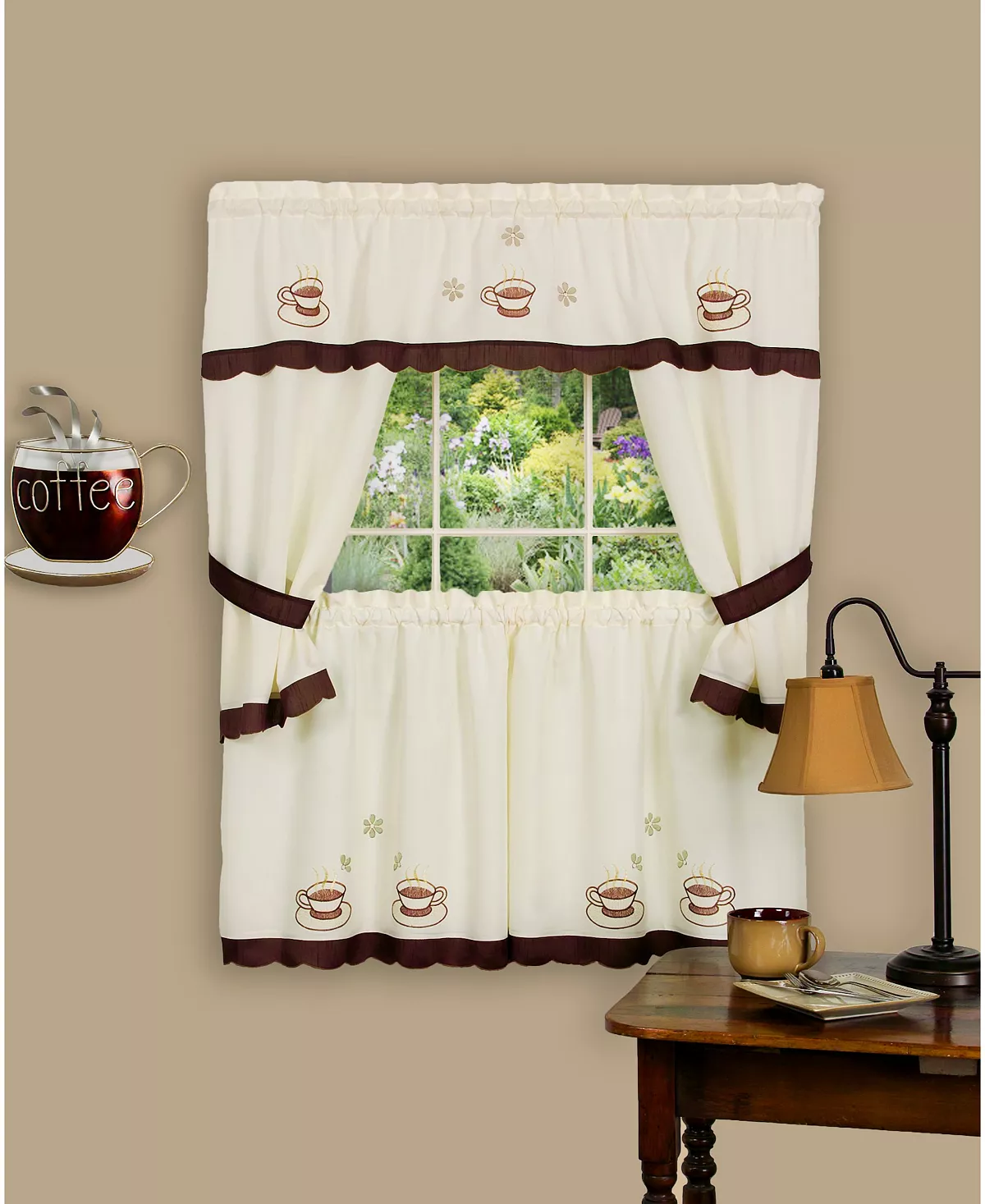 Bring the novelty of the café experience into your home with the Cuppa Joe Embellished Cottage Set. Each set is embellished with cups of hot coffee and gold lurex yarn detailing floral cutouts. The look is completed with solid brown scalloped borders and brown matching tiebacks.