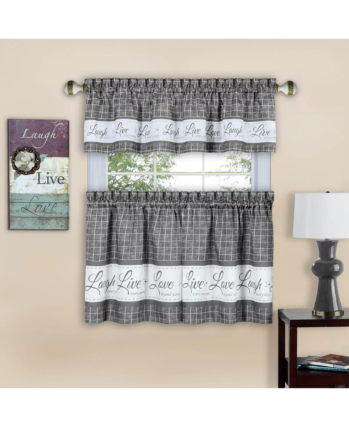 The Live, Love, Laugh Tier and Valance Window Curtain Set composes beautiful, printed words with a printed woven plaid, sure to inspire any room. The polyester fabric has a subtle woven texture and is machine washable.
