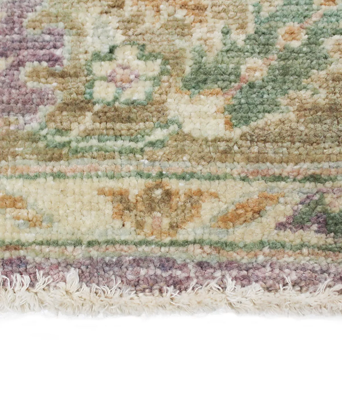 An assortment of traditional Persian-style floral motifs rendered in lush greens and cool mauve on the Mansehra 609025 area rug by BB Rugs balance classic charm and refreshing color. Hand-knotted of wool by master artisans, the rich feel of this piece complements its remarkable beauty.