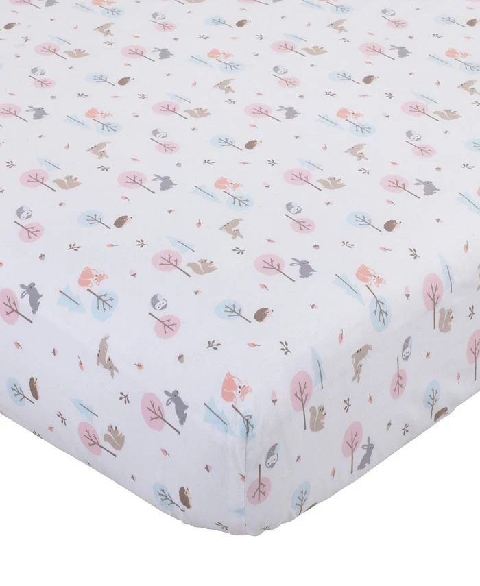Your little one will sleep soundly among the beautiful flowers, foliage and cute forest creatures included in this woodland design. This mini fitted crib sheet is perfect for a feminine, woodland-themed nursery.