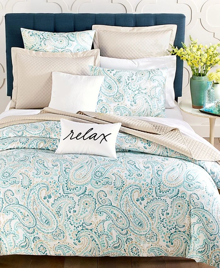 Add a fresh look to your room with this intricate paisley design in a hand-painted style from Damask Designs Charter Club. The teal colors are elevated with pops of soft tan.
