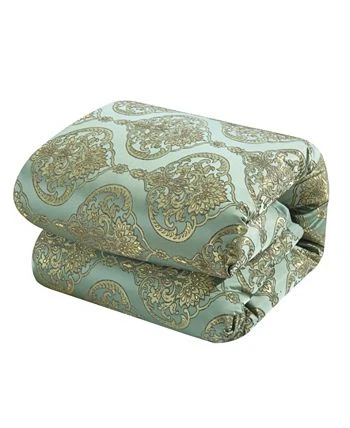 A rich, elegant Jacquard comforter set with everything you need for a complete bedroom décor makeover. The comforter features an elegant Jacquard scroll design with faux silk pleated flange. Design coordinated shams, a wide array of decorative throw pillows and a pleated faux silk bed skirt are included to complete the look.