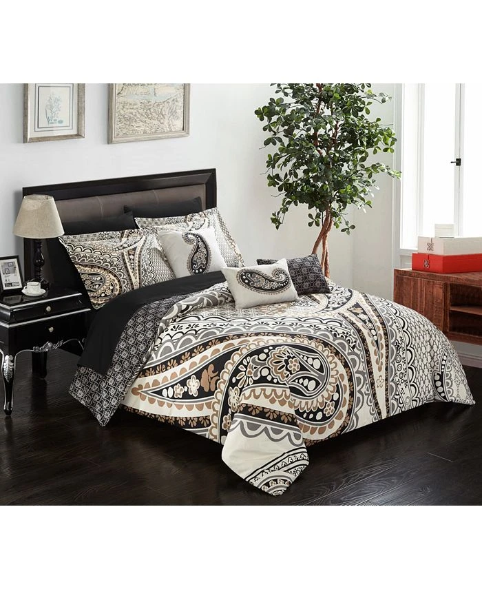 A fashion forward comforter set with everything you need for a complete bedroom décor makeover. Sophisticated, contemporary comforter featuring a large scale paisley print on the face and a contemporary geometric pattern on the reverse. Sheet set, design coordinated shams and decorative pillows are included to complete the look.