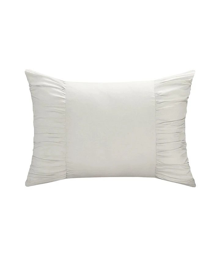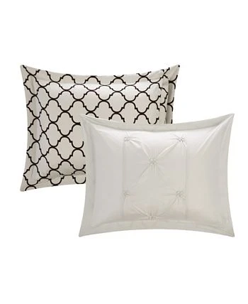 A fashion forward bed in a bag set with everything you need for a complete bedroom décor makeover. The comforter features a ruffled pinch pleat design on the face with a geometric pattern print on the reverse. Super soft microfiber sheet set, design coordinated shams and embellished deco pillows are included to complete the look.