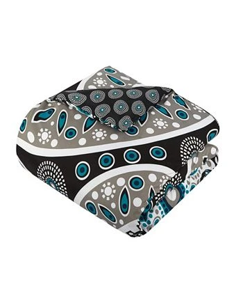 Free your spirit with this amazing large scale Bohemian contemporary globally inspired look. Detailed hints of black, grey, taupe and aqua blues, on black grounds truly compliment a true boho chic look. This set also is reversible to a contemporary design allowing you to change the look as per your mood. Included are embroidered detailed embroidery decorative pillows as well as a coordinating 4-pc sheet set to complete the look.