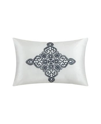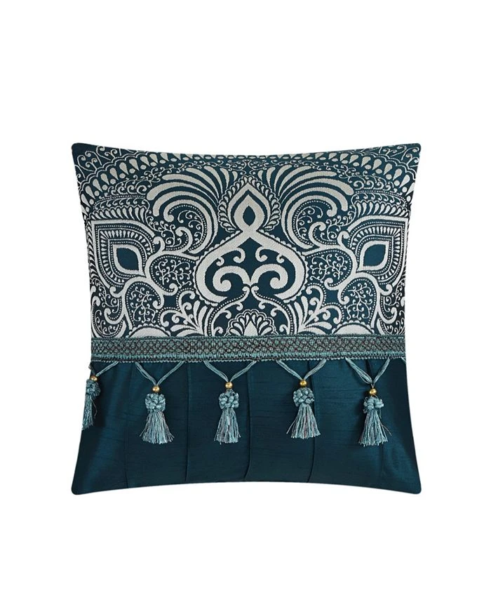 A stunning, ornamental Jacquard comforter set with everything you need for your bedroom décor makeover. This rich, elegant comforter features a Taj Mahal inspired large scale medallion embroidered design Design coordinated shams, a wide array of decorative throw pillows and a pleated faux silk bed skirt are included to complete the look.
