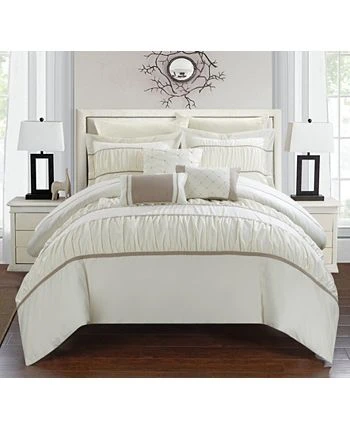 A fashion forward bed in a bag comforter set with everything you need for a complete bedroom décor makeover. Elegant and sophisticated embellished pleated comforter set with ruffle details. Super-soft microfiber sheets, design coordinated shams and deco pillows are included to complete the look.