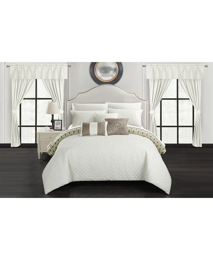 An elegant fashion forward bedding collection with everything you need for a complete bedroom décor makeover. Elegant and sophisticated quilting with two-tone geometric pattern print on the reverse. Super-soft microfiber sheets, design coordinated shams, trendy deco pillows and window treatments are included to complete the look.