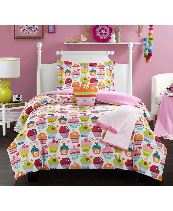A fun and colorful comforter set perfect for back to school or college with everything you need to a transform a child’s bedroom or a dorm. The comforter features a Sweet Dreams pastry theme design complete with rows of scrumptious tasty muffins. A muffin-shaped decorative throw pillow complements the comforter. Design coordinated pillow shams and a fleece blanket with a pattern print are included to complete the look.