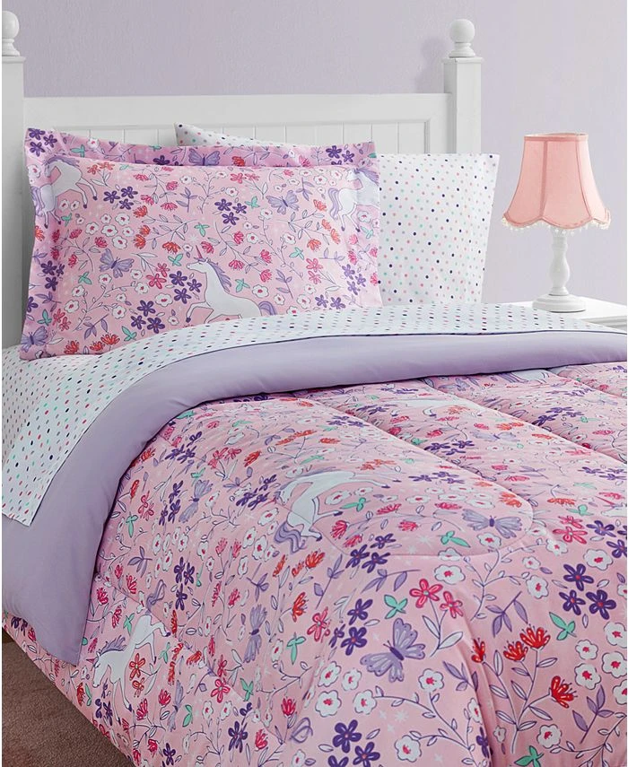Decorate any bedroom with Alexa & Bella pretty and whimsical Unicorn floral comforter set, which includes two sheet sets! Fairytale unicorns dance within a field of blooming flowers in bright shades of pinks, purple, aqua, coral and white.