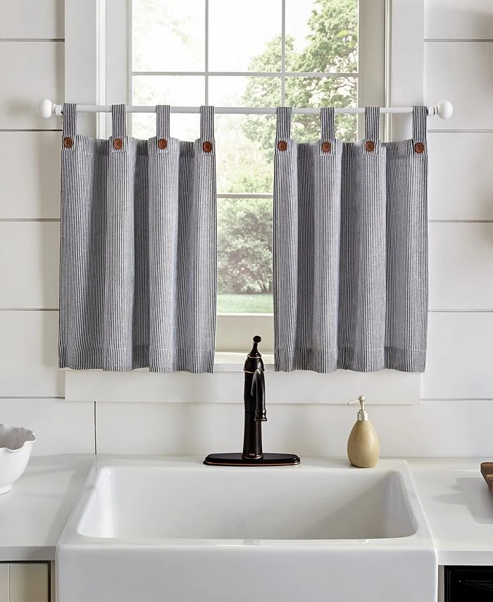 Stylish and versatile, the Tucker Tiers offer everything you need to create the shabby chic, modern farmhouse home. These fashionable kitchen tiers are made from premium quality cotton and feature the perfect ticking stripe, complemented by tab tops and decorative wooden button embellishment.