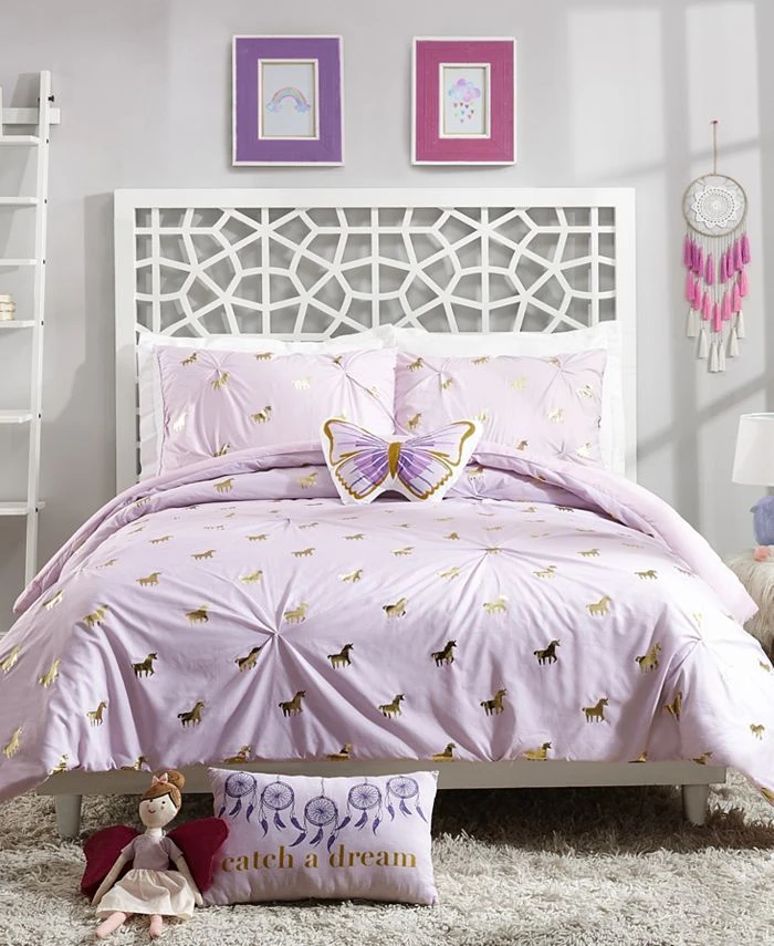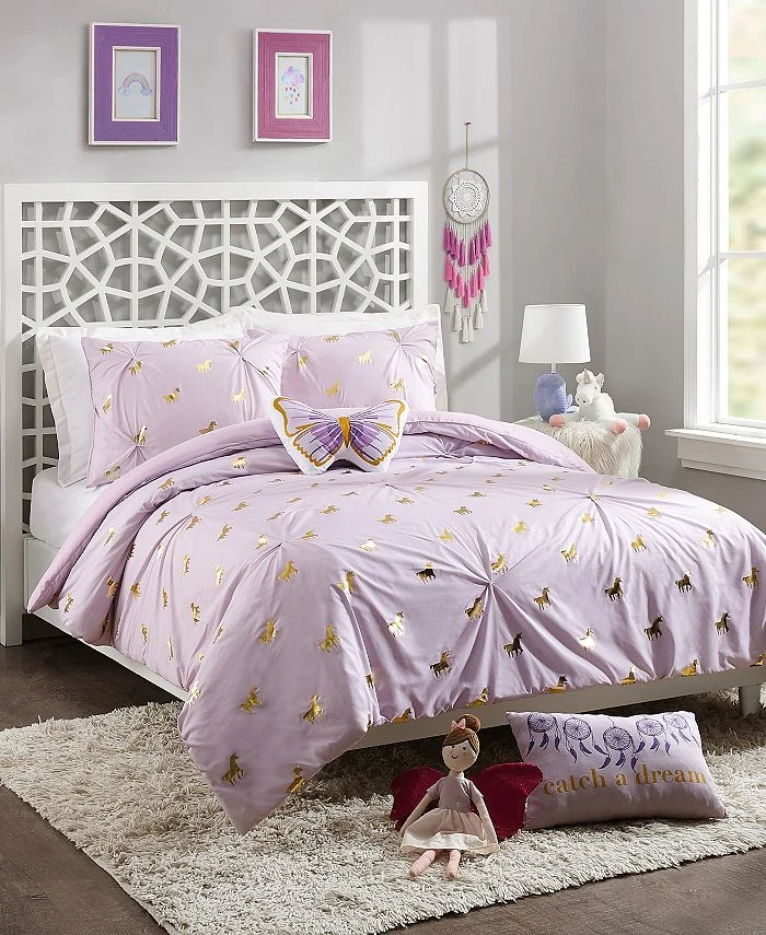 Unicorns Will Be Dancing In Her Head With This Adorable Comforter Set From Jessica Simpson. Golden Foil Printed Unicorns Prance Across The Lavender Ground. The Kissing Pleats Add A Sweet Finishing Touch.