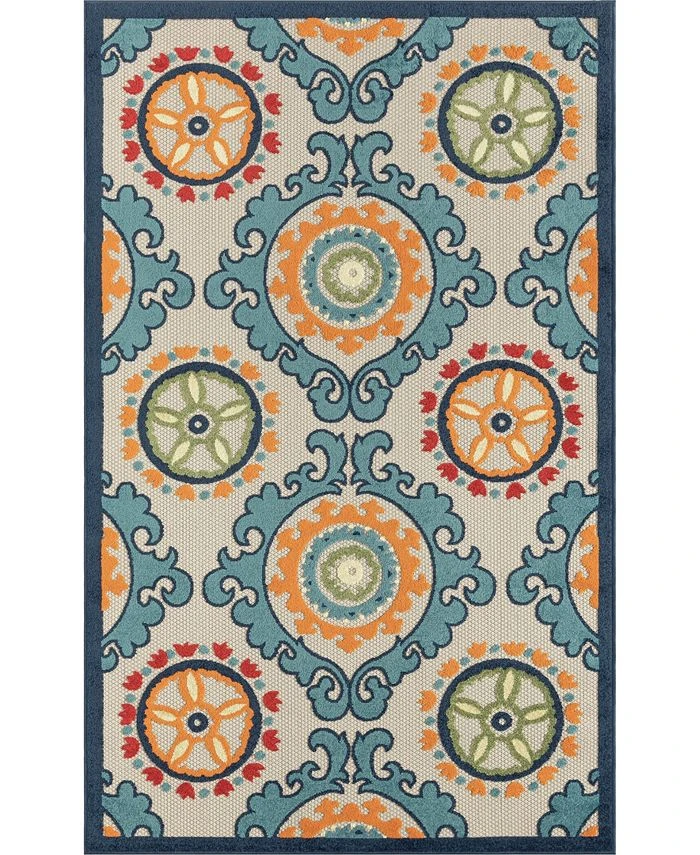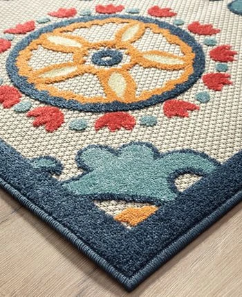 The Suzani Medallion High-Low Indoor Outdoor Area Rug brings bright Mediterranean motifs and terrific high-low texture to all your spaces. This power-loomed area rug is constructed with stain-resistant and colorfast polypropylene fibers to provide long-lasting styles with easy to clean features.