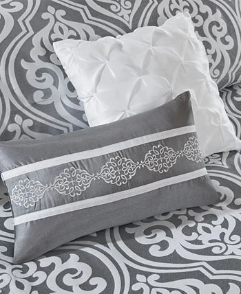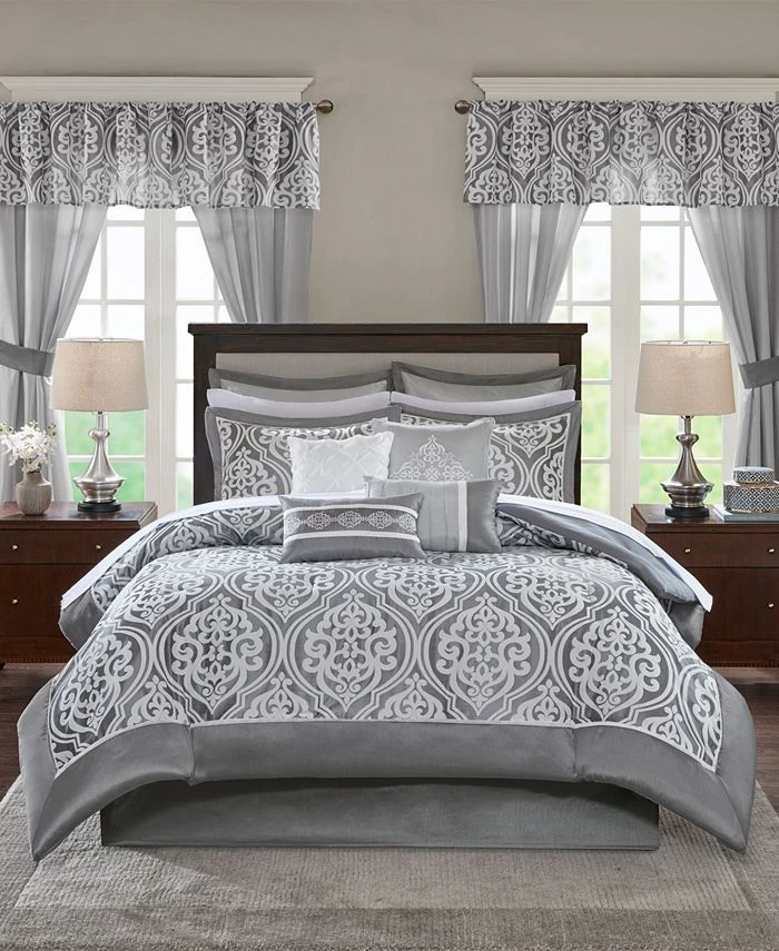 Revamp your bedroom with the Essentials Jordan room in a bag from Madison Park. The jacquard comforter creates a lavish look with its traditional ornate pattern and pieced design in rich hues of gray and white, while the coordinating shams reflect the motif seen on top of the bed. Four decorative pillows with embroidered details and a solid bedskirt provide the finishing touches to complete the collection. Also included are four solid window panels and two valances that allow you to create the perfect balance of style in your bedroom. Each window panel matches back to the bedding set and includes a tieback to give a clean and crisp finish to your decor.