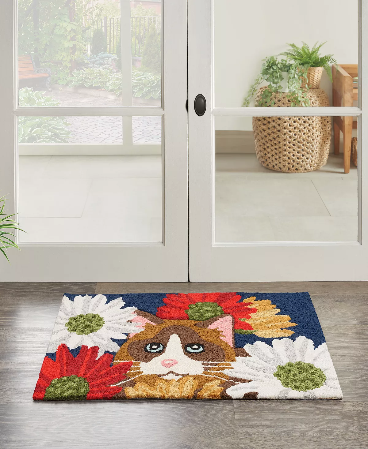 Hand Hooked Cat with Daisies Accent Rug 18×30