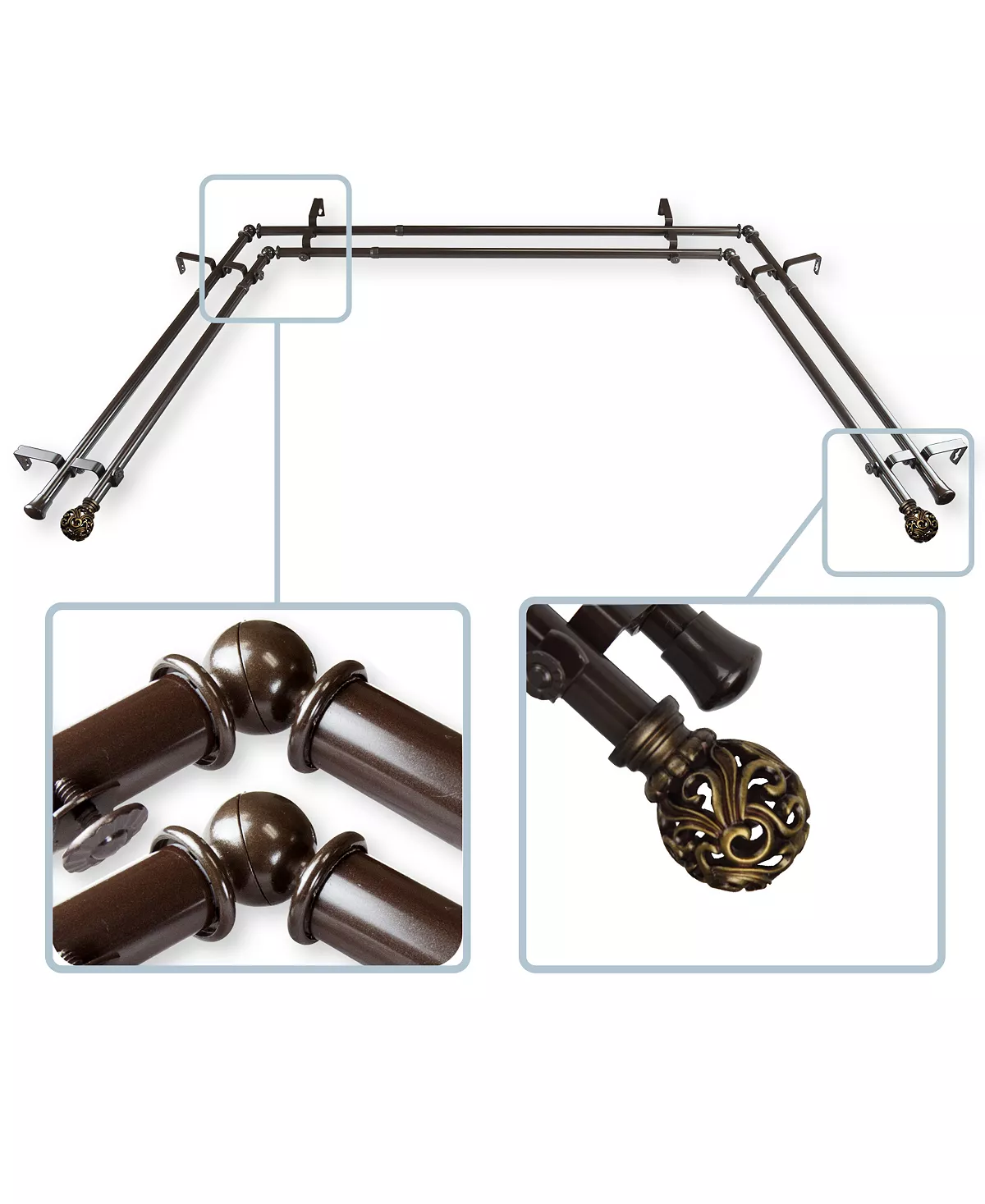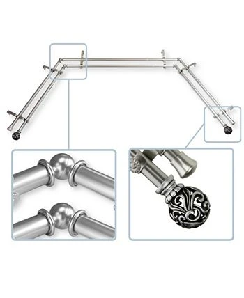 - Includes – Double bay curtain rods, finials, corner connector, and mounting hardware