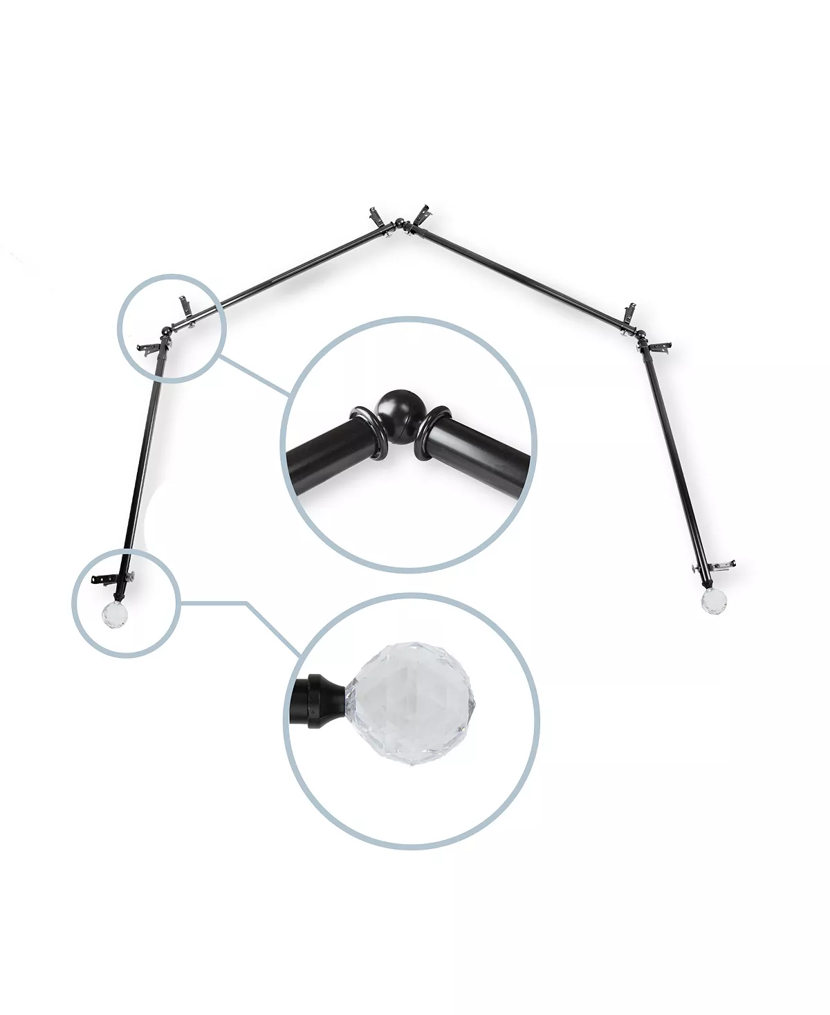 - Includes – 4 adjustable curtain rods, finials, corner connector, and mounting hardware
