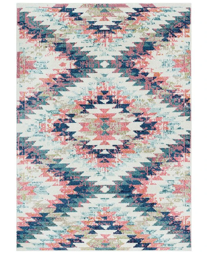 - Colors: White ground with beige, camel, bright pink, aqua, teal, dark blue, black and lime accents