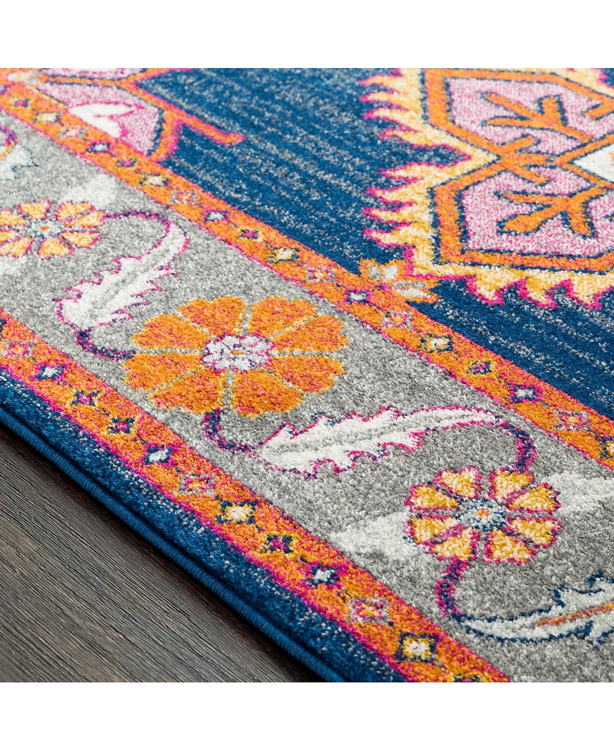 - Colors: Dark blue ground with medium gray, light gray, garnet, burnt orange, saffron and white accents