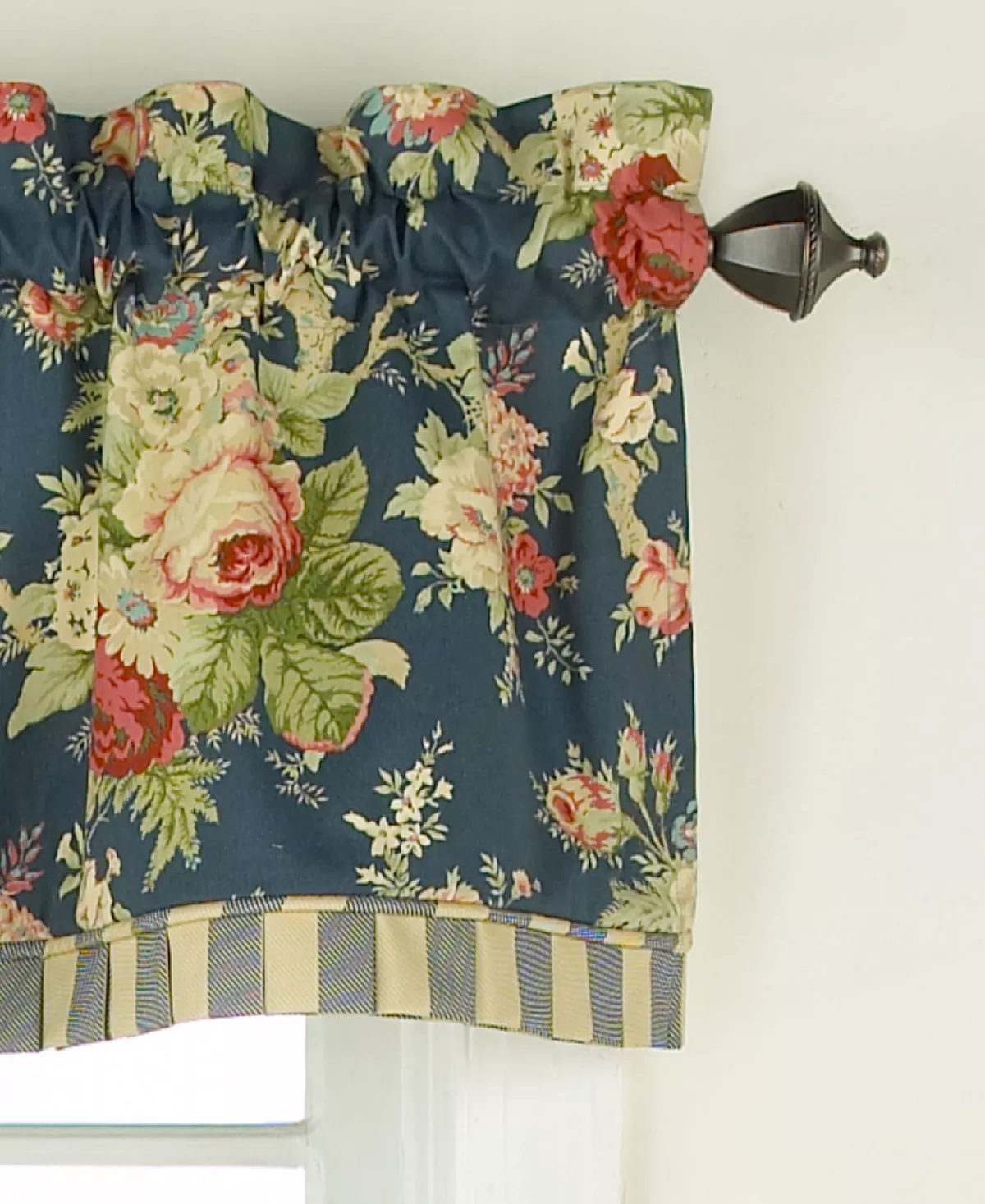 Refresh any room in your home with classically elegant window treatments by Waverly®. This timeless valance features blush florals on a striking blue ground. Box-pleat striped trim adds charming style.